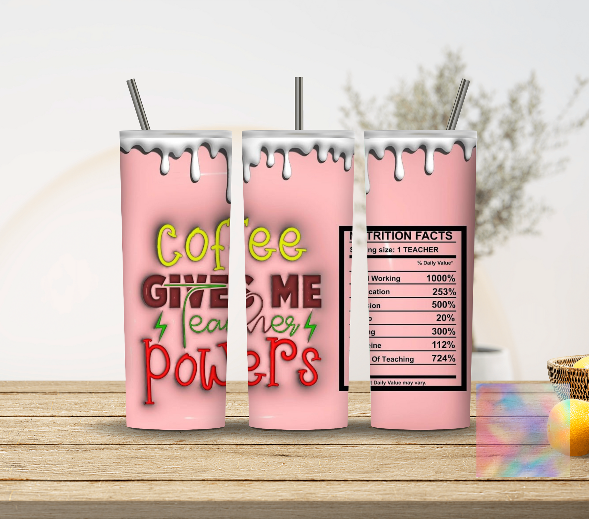 "Unlock your teaching potential with every sip from Coffee Gives Me Teach Powers 20oz skinny tumbler. Keep your coffee hot and your spirits high as you conquer the day with this powerful drinkware. Perfect for long days in the classroom or on-the-go teaching adventures. Say goodbye to lukewarm coffee and hello to your new teaching sidekick."