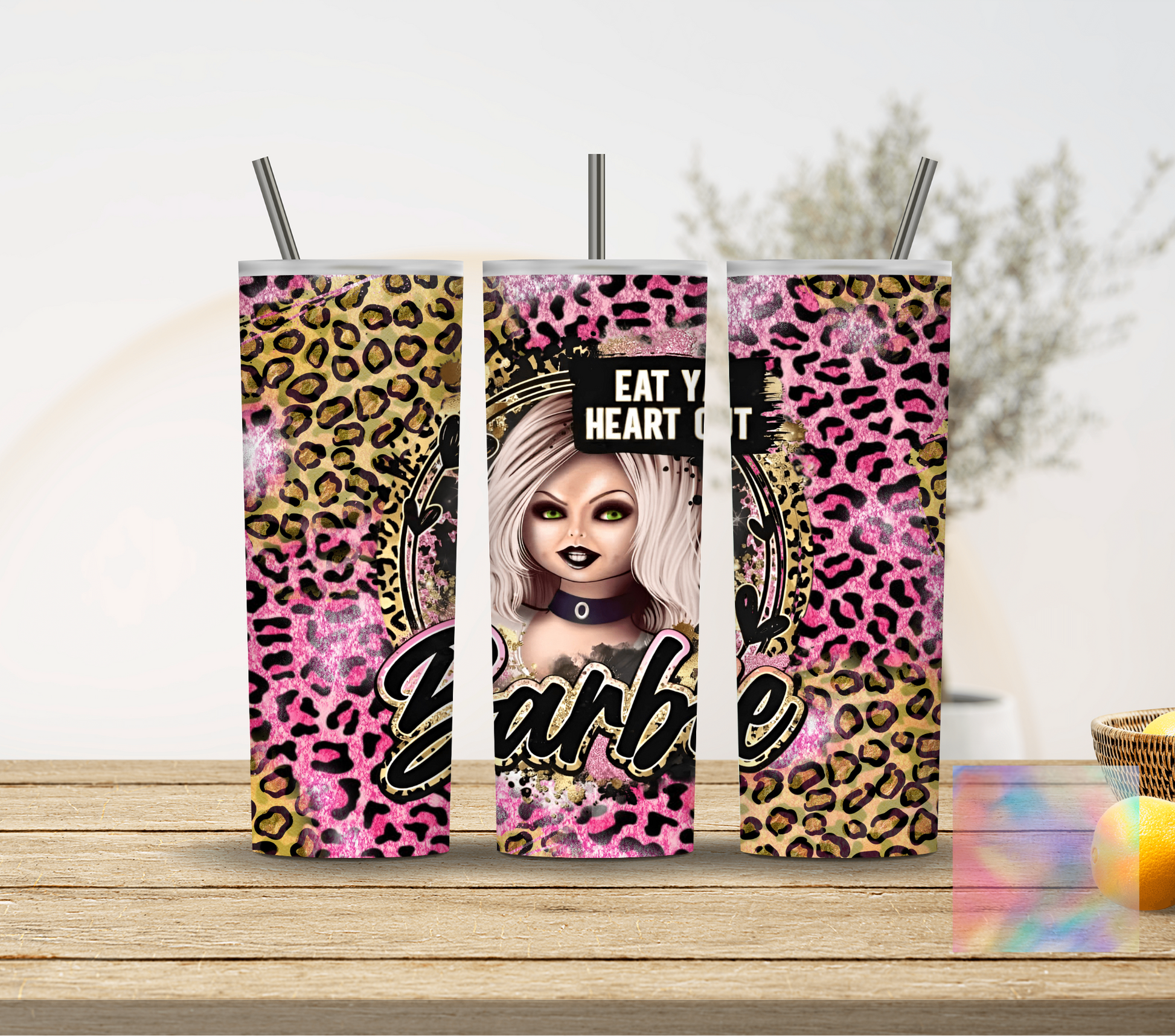 The Eat Ur Heart Out Barbie 20oz skinny tumbler is sure to keep your drinks hot or cold all day long. It has double-walled vacuum insulation with a sweat-proof finish, maintaining beverage temperatures up to 6 hours. Perfect for on-the-go hydration and keeping your favorite drinks in the perfect condition.