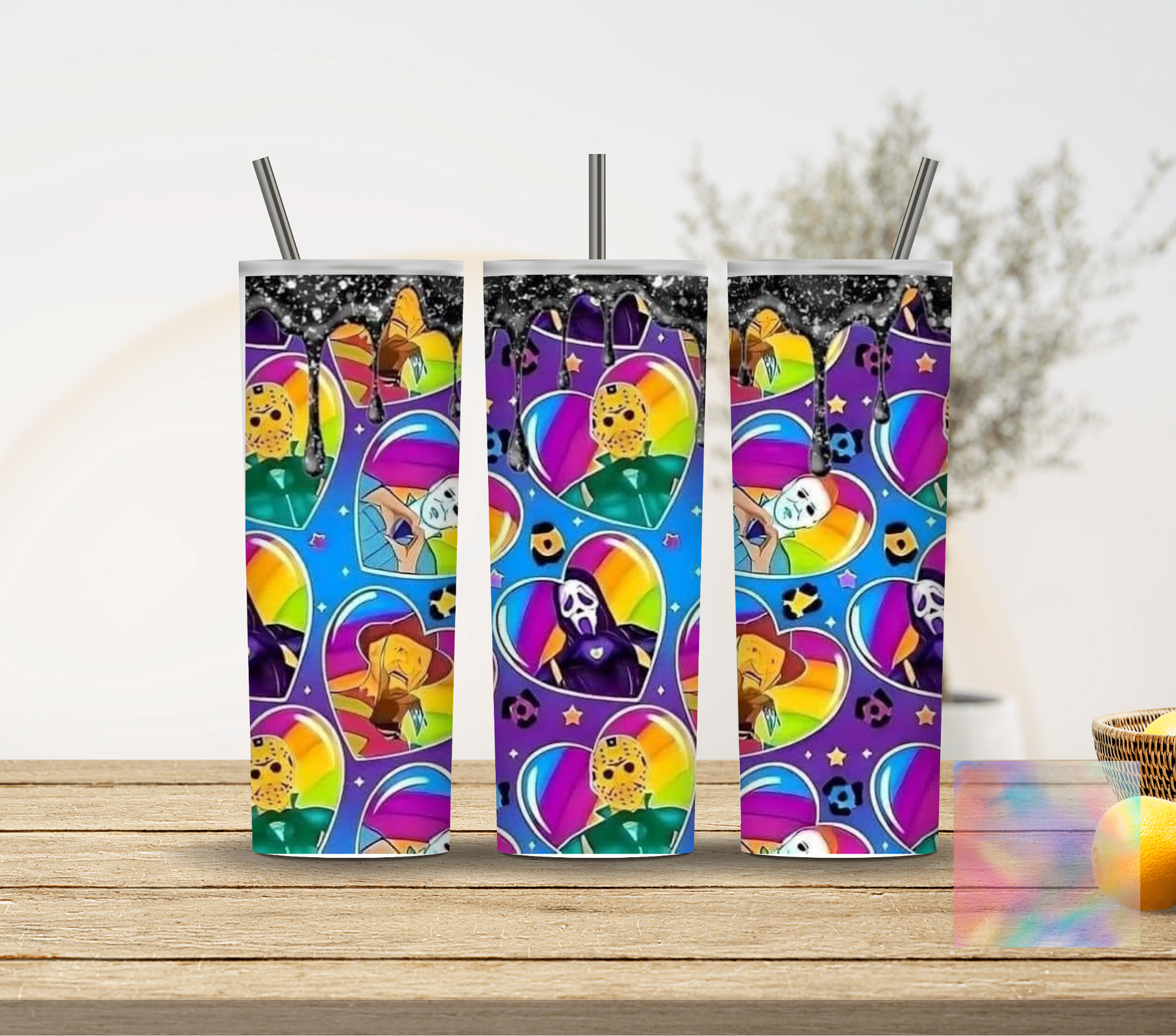 The Halloween Horror Friends 4 20-ounce skinny tumbler is perfect for your favorite beverages. Made with double wall insulation, your drink stays cool for longer and won't leave condensation on the outside. Enjoy your favorite cold drinks all year round without worrying about them becoming warm too quickly.