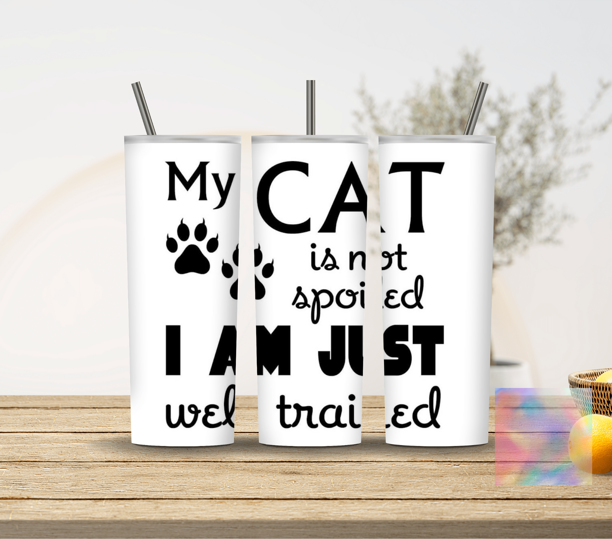 This 20oz skinny tumbler will keep your cat's drinks cold and show the world just how spoiled they are! The design is printed on both sides of the stainless steel tumbler, ensuring a lasting finish. Show your cat some love and get them this tumbler today!