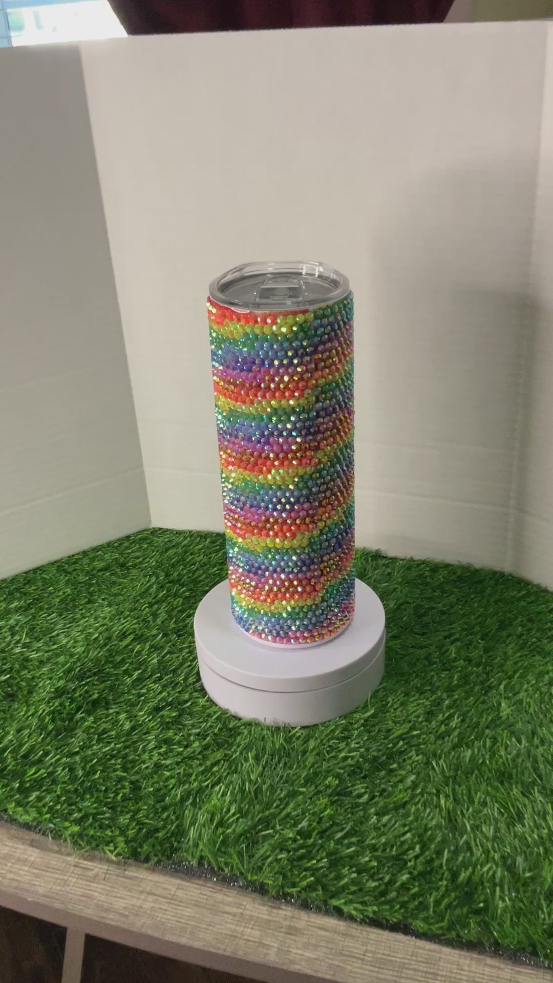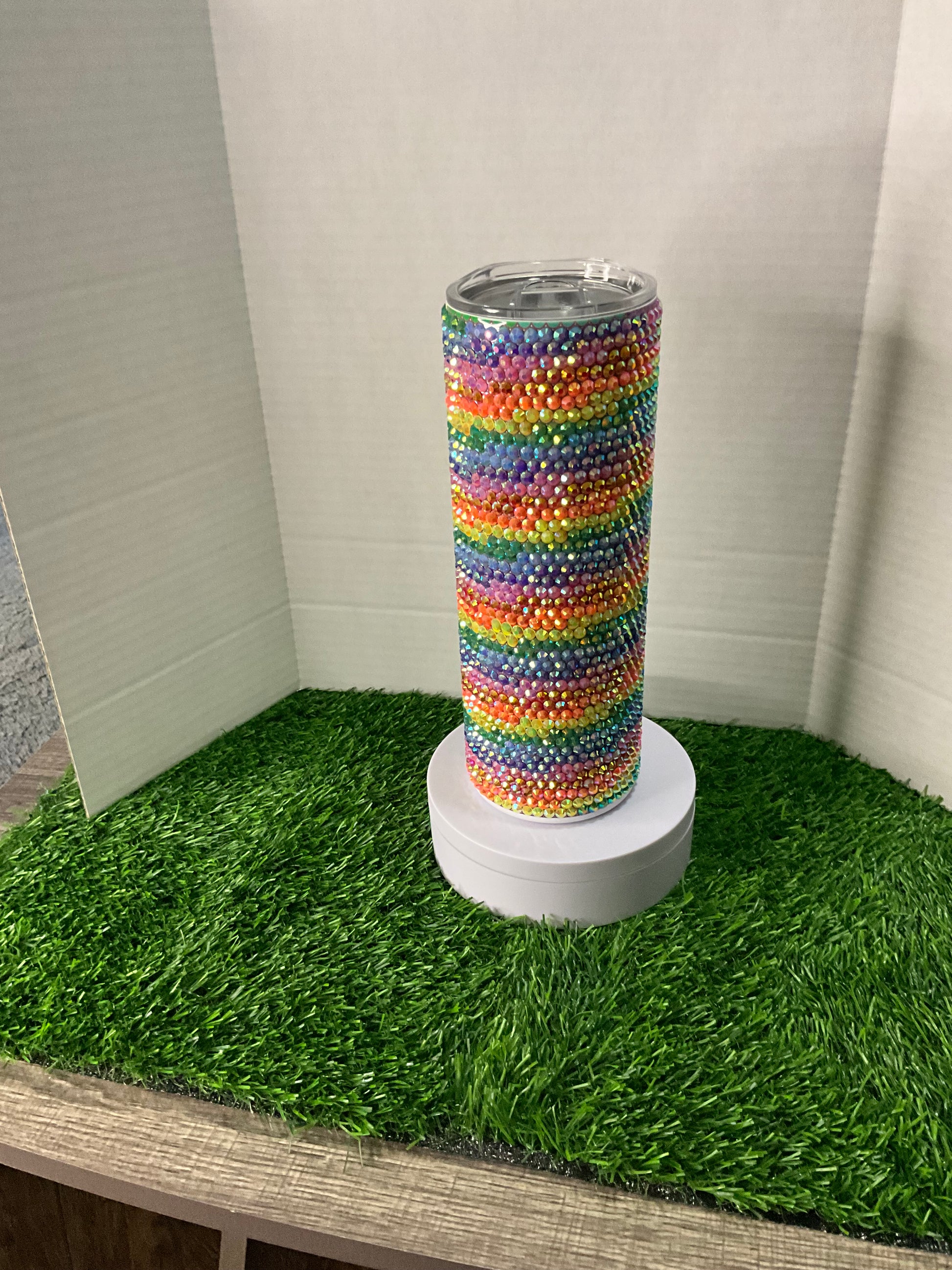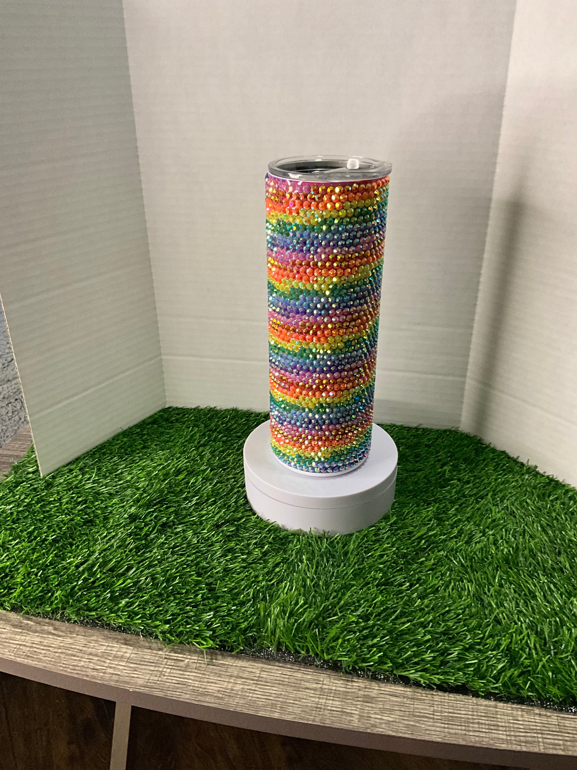 Who loves rainbows if so this Rainbow Rhinestone 20oz skinny tumbler just for you!!!! Comes with 2 straws and a lid and rubber bottom